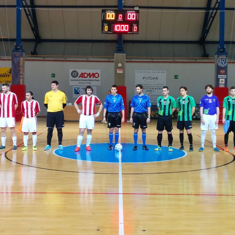 Dopo un avvio positivo che ha visto andare subito al tiro i neroverdi con capitan Buriola da metà campo, e la risposta della squadra di casa con Saviano Rudy, è il Calcetto Lignano a farsi più pericolo: già al 3' Mosangini pizzica il palo con una conclusione dalla destra, situazione che si ripete al 6' con il palo pieno di Imazio; solo questione di secondi perché al 7' ancora Saviano Rudy trova il palo, ma questa volta Perelli è pronto a due passi ed insacca la rete del vantaggio.